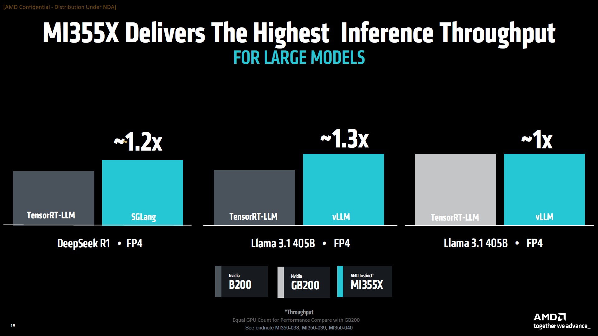 MI355X 在主流的超大模型中相比 B200 可有著 1.2-1.3x 倍的提升,而且是在新加入的 FP4 精度上的效能領先,至於相比 GB200 則是效能相當的表現。Instinct MI355X 相比 B200 有著 40% 更多的每元 Tokens/$。