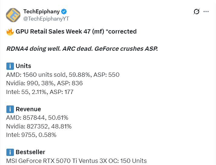 數據顯示,2025年第47週,Mindfactory總計售出1560張AMD顯示卡,而NVIDIA顯示卡銷售未及1000張。
