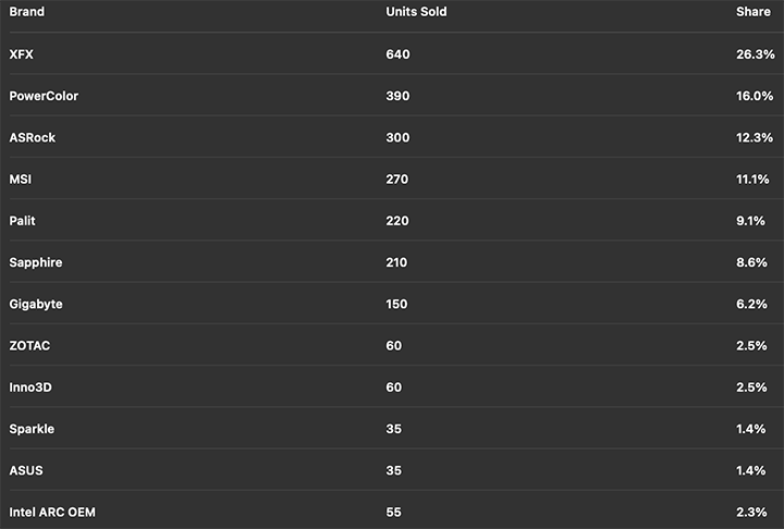 至於Intel,則是有點查無此人,總計售出55張,Arc B580、Arc A380分別售出20張。