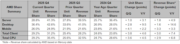 根據市場調查研究機構Mercury Research最新報告,2025年第四季全球x86處理器市場上,AMD再次取得重大勝利,從桌上型到筆電再到伺服器,市場佔比、收入佔比皆攀升。