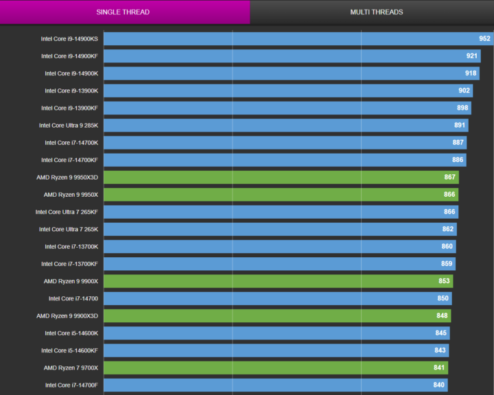 作為對比,AMD、Intel最高皆未到1000分,最好的是Core i9-14900KS 952分,另外Ryzen 9 9950X3D 867分、Core Ultra 9 285K 891分。高通驍龍X Elite則不到800分,差了一倍,完全不屬同一等級。