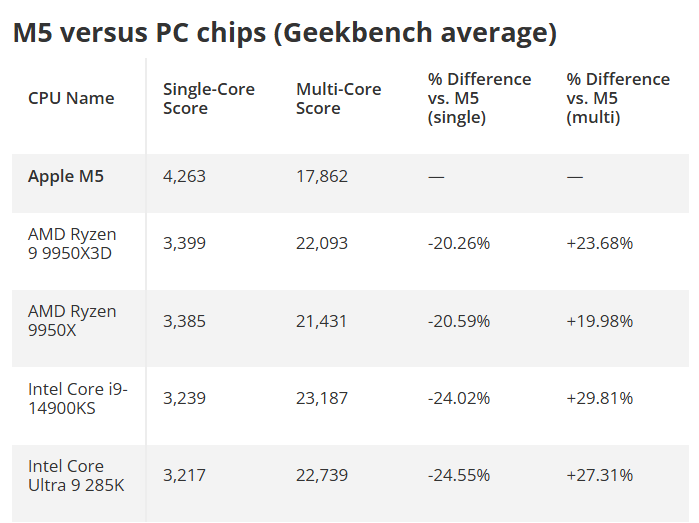 蘋果M5處理器單核心效能驚人 AMD、Intel、高通都看不到車尾燈
