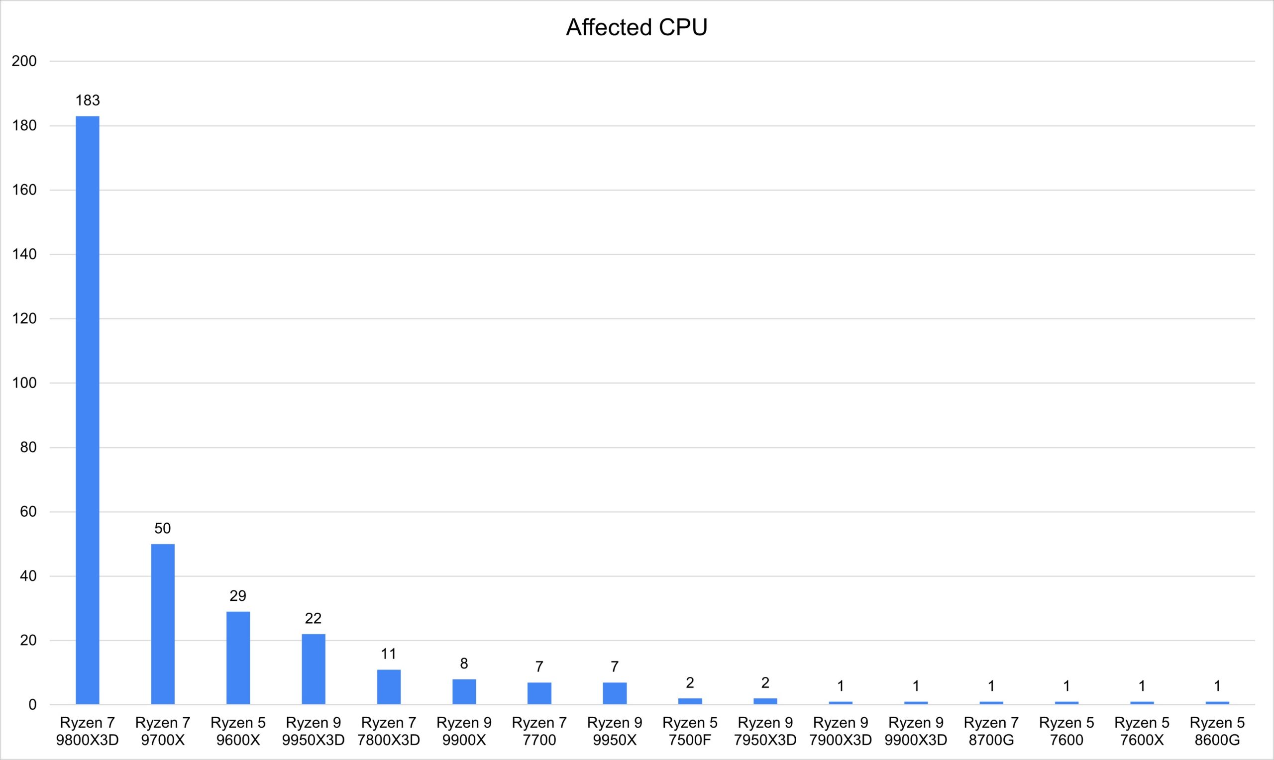 至於是 CPU 問題還是主機板造成,目前 AMD 與 ASRock 都無法提供完整的解法,根據 u/RumbleTheCassette 整理的 ASRock CPU Failure survey,影響的 CPU 最多為 9000 系列但也有零新 7000 系列處理器遇到同樣問題 。