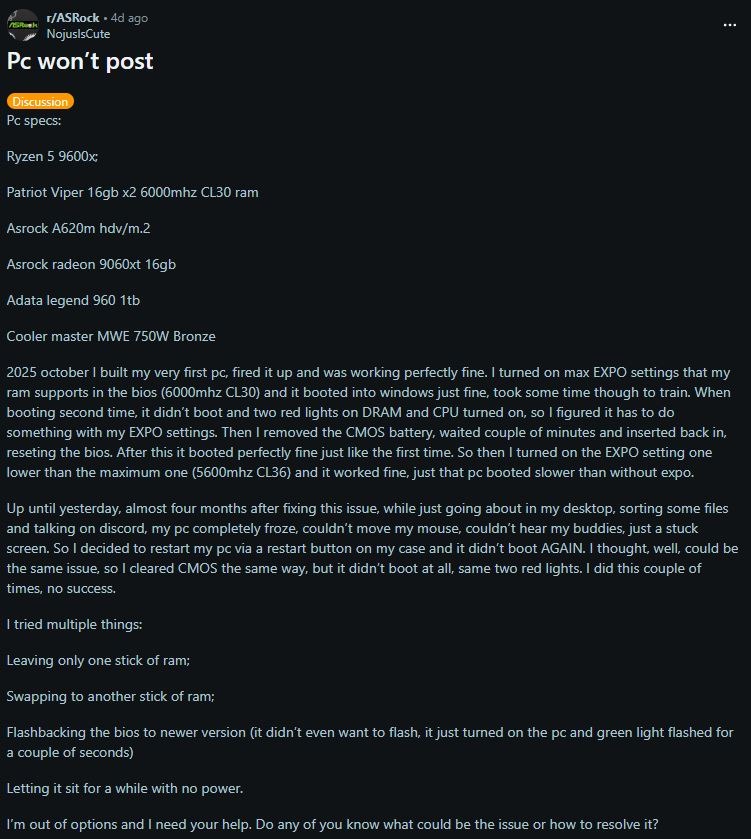 像是 u/NojuslsCute 與 u/RobotRollCall24,都回報電腦之前使用正常,但突然間主板無法正常 Post,也就是說主板通電下不開機。