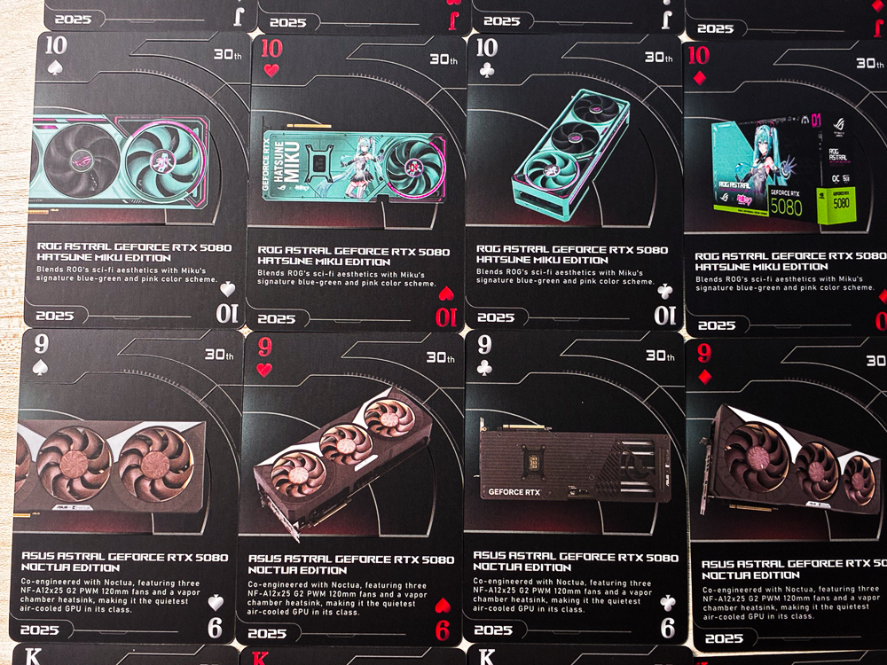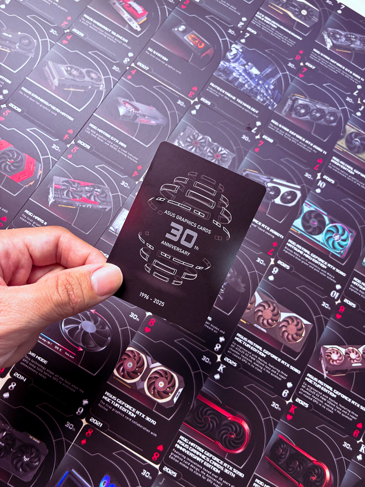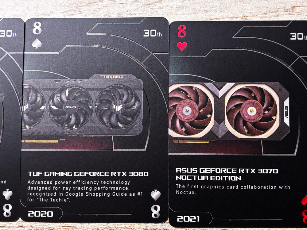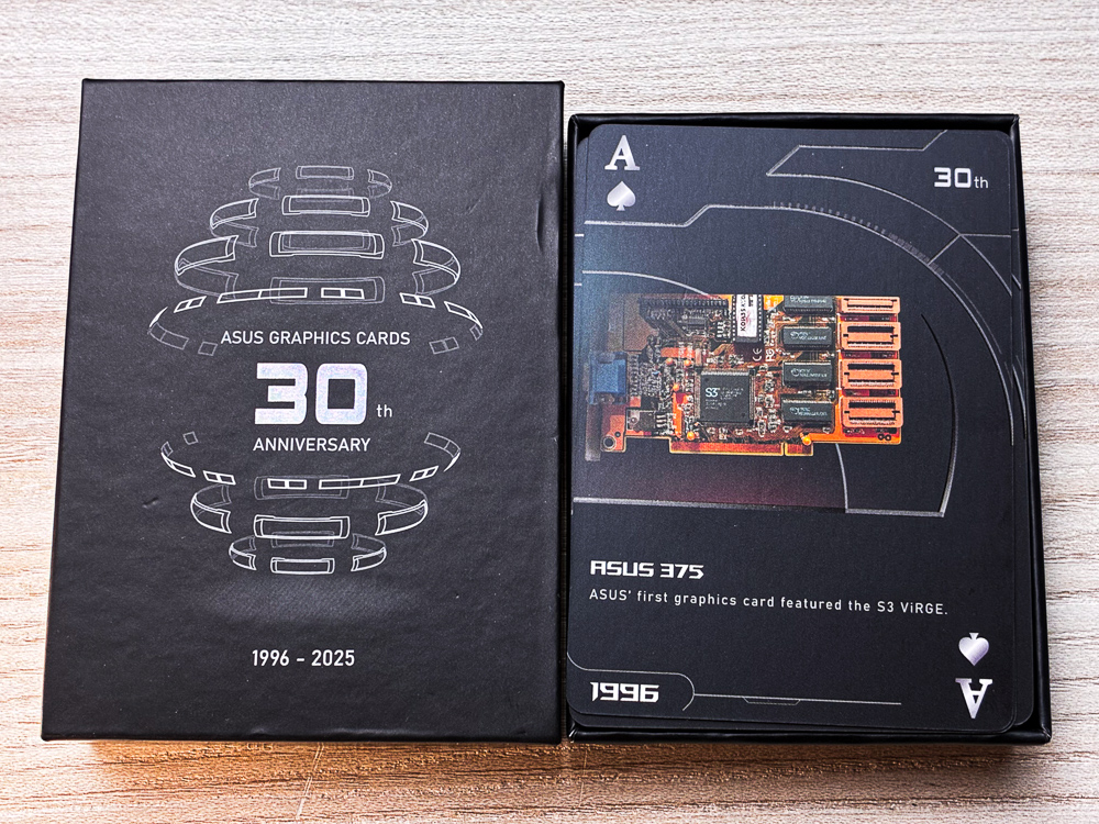 華碩顯示卡 30 週年囉!從 1996 年推出第一張顯示卡產品直至 2025 年已將近 30 年頭,這次 30 週年紀念撲克牌,將華碩顯卡產品的大事紀印在牌上,讓玩家可稍微瞭解華碩顯卡的改變。