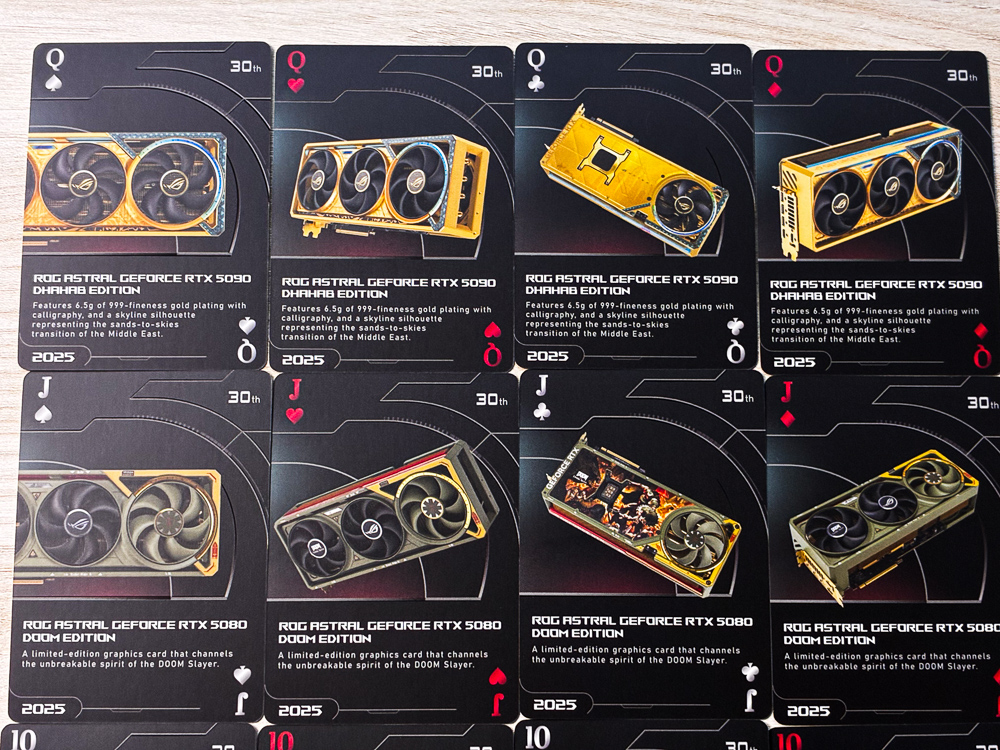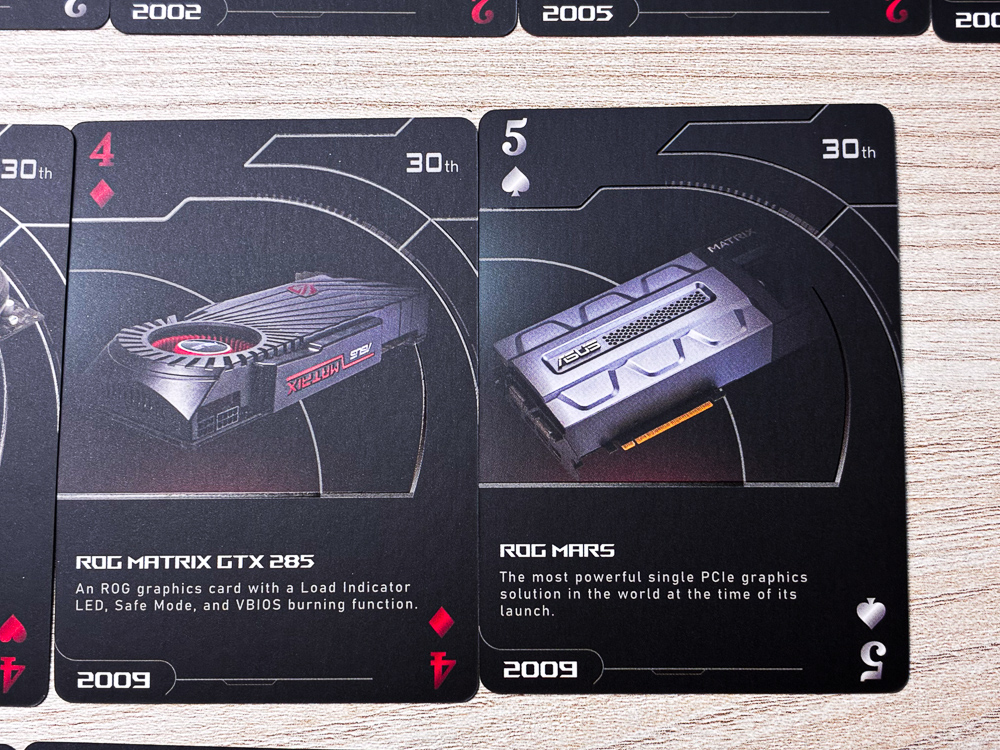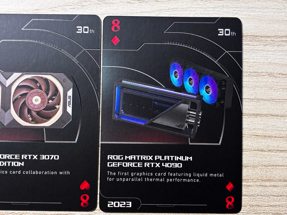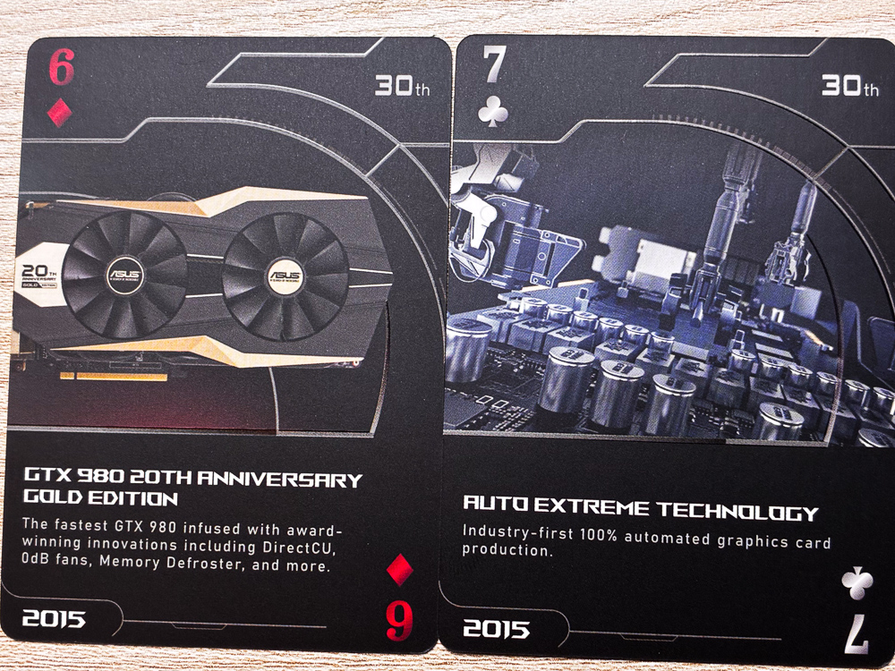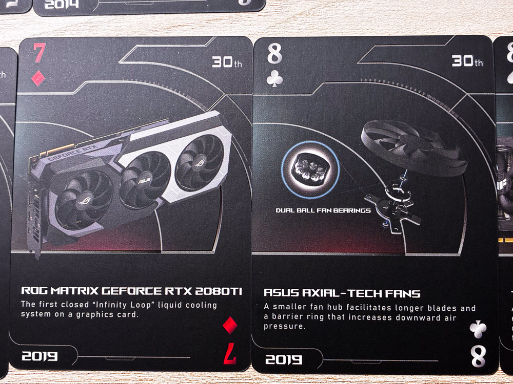 華碩顯示卡 30 週年囉!從 1996 年推出第一張顯示卡產品直至 2025 年已將近 30 年頭,這次 30 週年紀念撲克牌,將華碩顯卡產品的大事紀印在牌上,讓玩家可稍微瞭解華碩顯卡的改變。