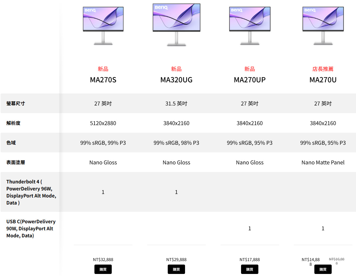 MA270S 與 MA320UG 即日起至 3 月 5 日開放預購。為歡慶 MA 系列 Mac 最佳外接螢幕旗艦款上市,BenQ 推出 MAKE IT READY!一馬當先,效率加倍!優惠活動。即日起至 2026 年 2 月 28 日,凡購買 MA 全系列任一機種,即贈價值 $4,290 的 BenQ ScreenBar Pro 護眼螢幕掛燈,再加碼抽最新 iPhone 17 Pro Max!以最強周邊組合,邀您體驗最懂 Mac 的專業顯示器。