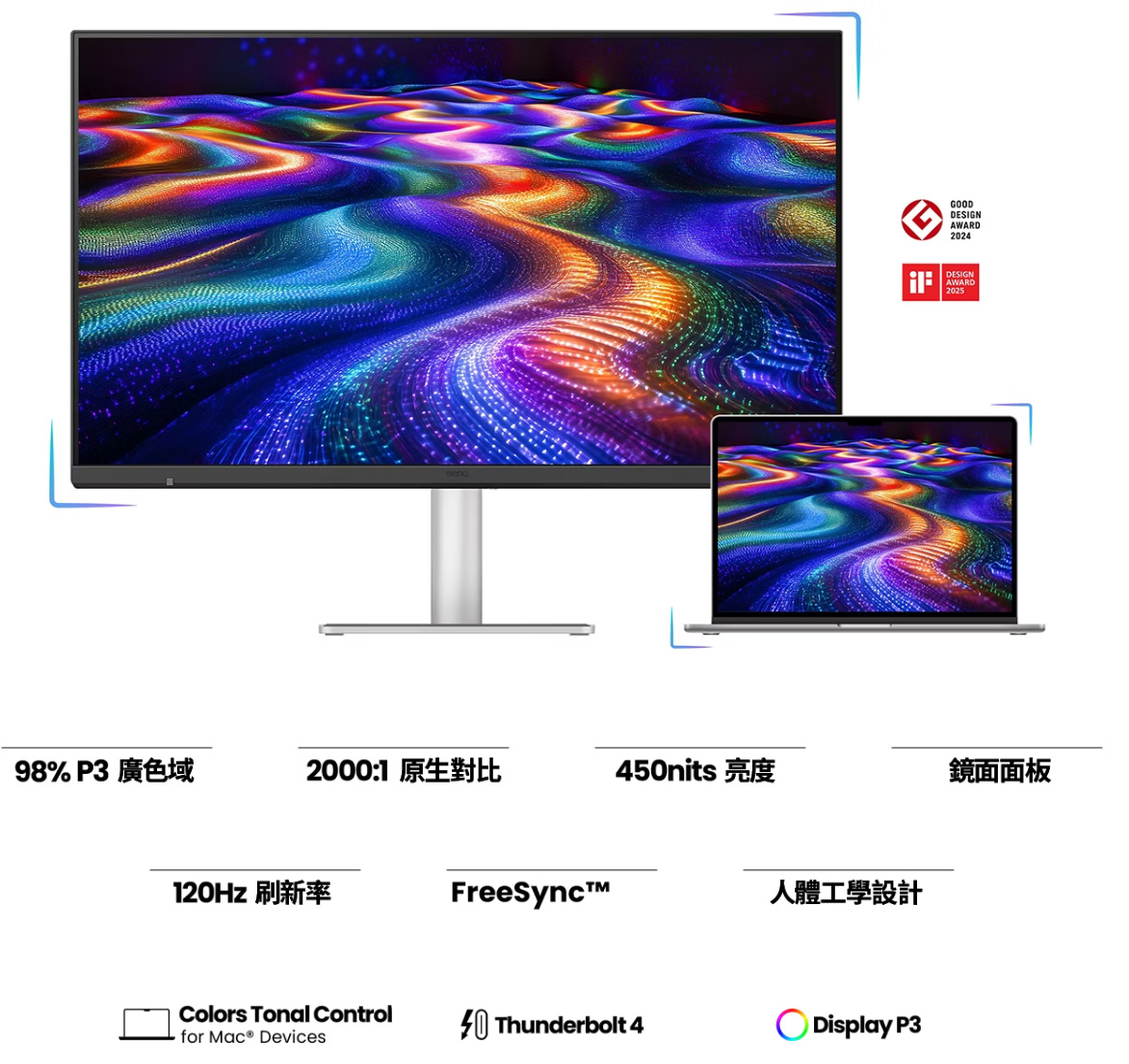 兩款旗艦機皆支援強大的 Thunderbolt 4(96W + 15W),可進行菊鏈串接與高速充電;搭載 Smart KVM 功能,僅需一組鍵盤與滑鼠即可在 MacBook Pro、Mac mini 或 Mac Studio 的混合工作環境間無縫切換,加上 150mm 高度可調式人體工學支架,打造舒適高效的創作環境。