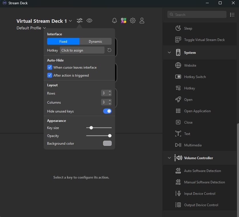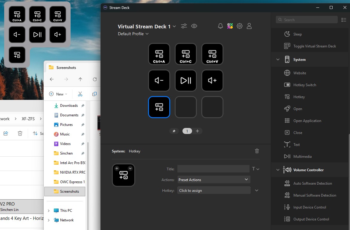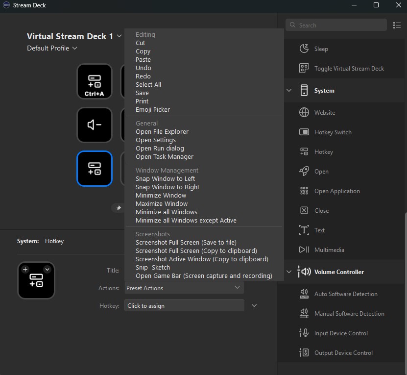Stream Deck 軟體提供相當多的自訂功能,包含系統功能、多媒體,以及最常用的「HotKey」,可設定 app 常用的組合按鍵,如此一來即可利用 VSD 加速複雜操作。