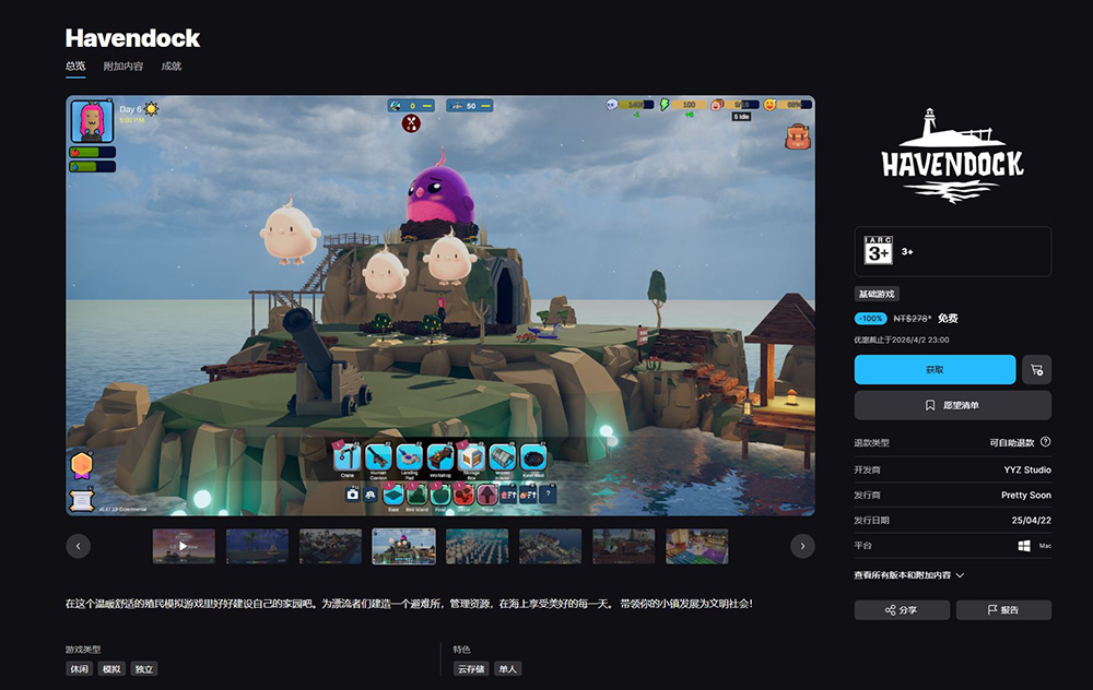 又到了每週必領的 Epic 遊戲限免時間,這次送出的是 《海港物語(Havendock)》和《Hyper Echelon》 兩款佳作,領取截止至 2026 年 4 月 2 日 23 點。