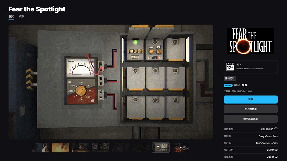 《 Fear the Spotlight 》是一款由Cozy Game Pals工作室開發與 Blumhouse Games 發行的第三人稱恐怖冒險遊戲,於2024年10月22日首度發售。