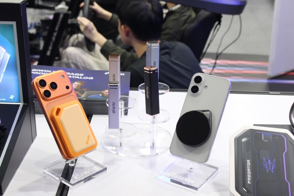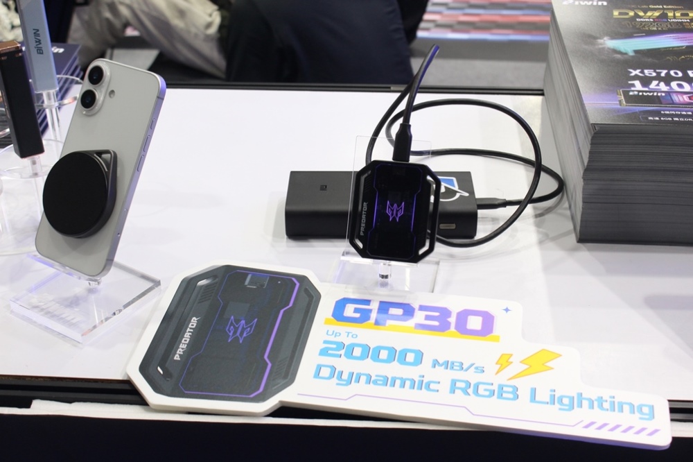 行動固態硬碟方面展出了Amber PM2000 (磁吸式行動硬碟)、Amber PR2000 (強固型行動硬碟)與PD450 (輕巧美型款),還有與Acer合作的Predator (掠奪者) GP30 RGB 行動固態硬碟。