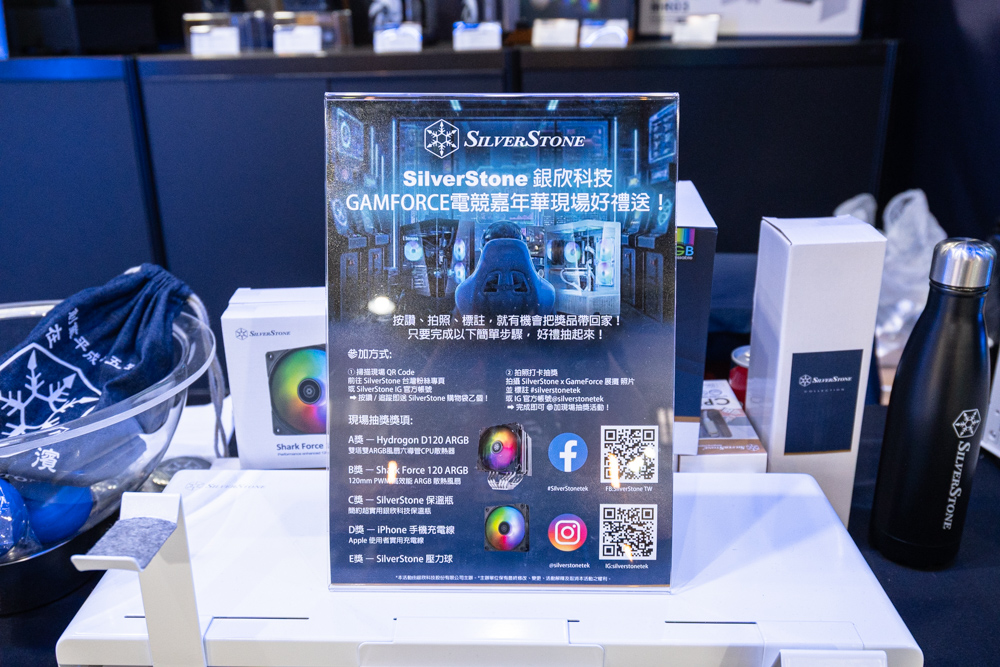 來到 GAMFORCE 的玩家只要掃描 QR-Code 按讚銀欣粉絲團與 IG 即可參加抽獎,有著散熱器、風扇、保溫瓶、充電線與壓力球,只要參加人人有獎的好康優惠。
