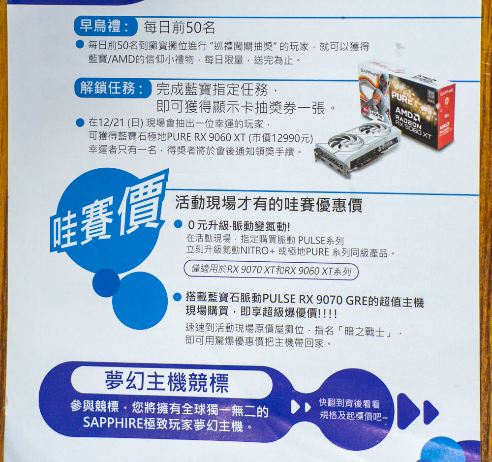即可獲得 顯示卡抽獎券 一張,抽萬元PURE RX 9060 XT。 (每日一次;市價12990元) - 活動現場凡購買指定的 脈動PULSE系列顯卡,再享「0元升級」誠意優惠