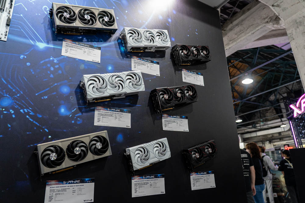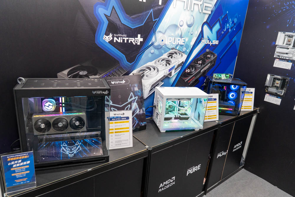 做為板卡大廠的活動攤位,當然不能少了顯卡與主機板產品展示,攤位現場有著佈滿整面看板的霸氣板卡大牆;從左至右,有著氮動 NITRO+、極地 PURE、脈動 PULSE 系列的 9070XT ~ 9060XT 16GB霸氣顯卡牆,主機板也有X870 / B850 A大板 ~ B850M小板組成震撼主板牆。