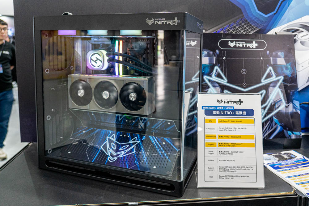 而現場的藍寶石展示機,採一字排開讓玩家能近距離觀賞,分別為氮動NITRO+ 猛獸機與極地PURE精靈機,以及氮動NITRO+ 戰士機,皆搭載對應NITRO+與PURE系列的9070 XT 16GB高階顯示卡,搭配 9800X3D頂規處理器,與 6000MT/S DDR5 32GB (16GB x2 ) 記憶體,而主板則分有 NITRO+ B850A WIFI 7與 PURE B850M WIFI兩款;這規格看得筆者都動心了。