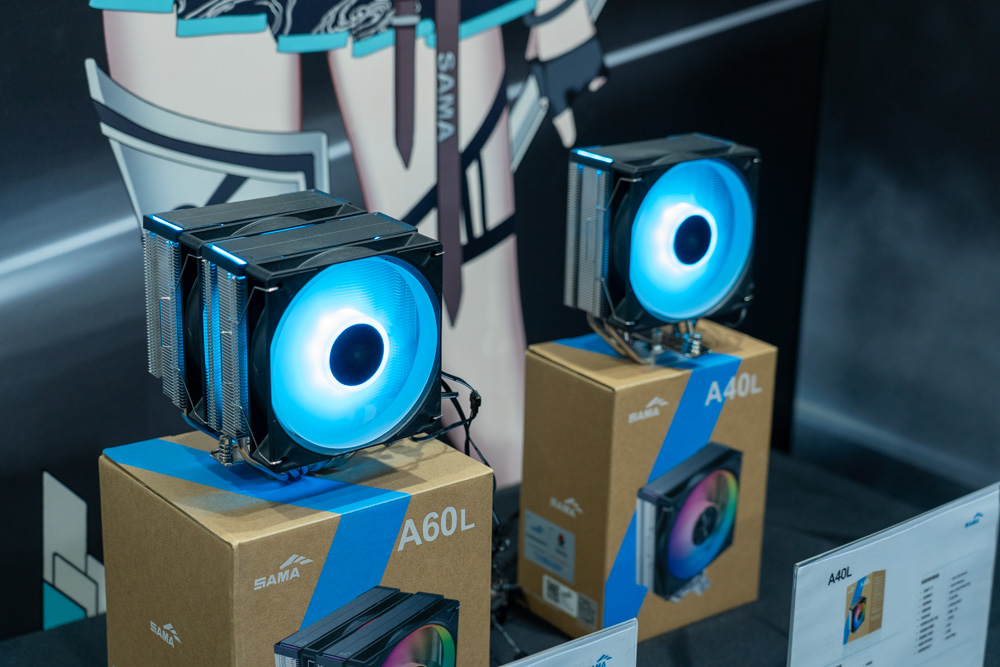 接著空冷展示區,分別由A60L 與 A40L 兩款空冷產品展示;A60L 空冷散熱器,採用雙塔結構設計,有著 6 根熱導管與鍍鎳純銅的散熱底座,以回流焊接緊密結合,提升散熱效率,搭配兩顆 120mm ARGB 導流環風扇,與混和鰭片設計,提供高達 TDP 265W 解熱能力。