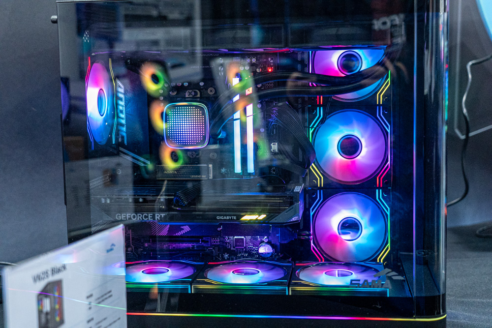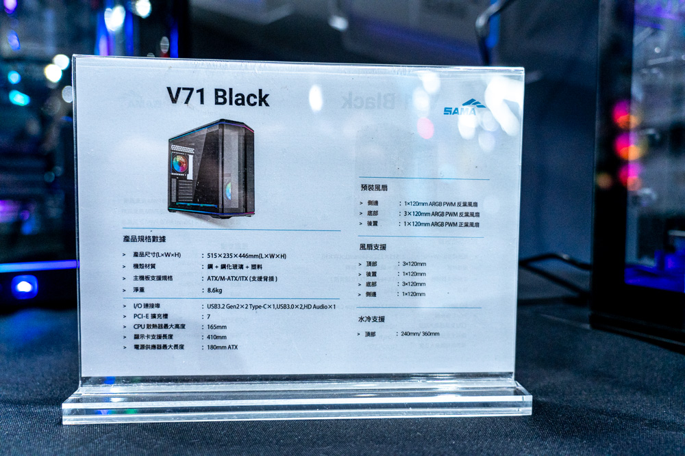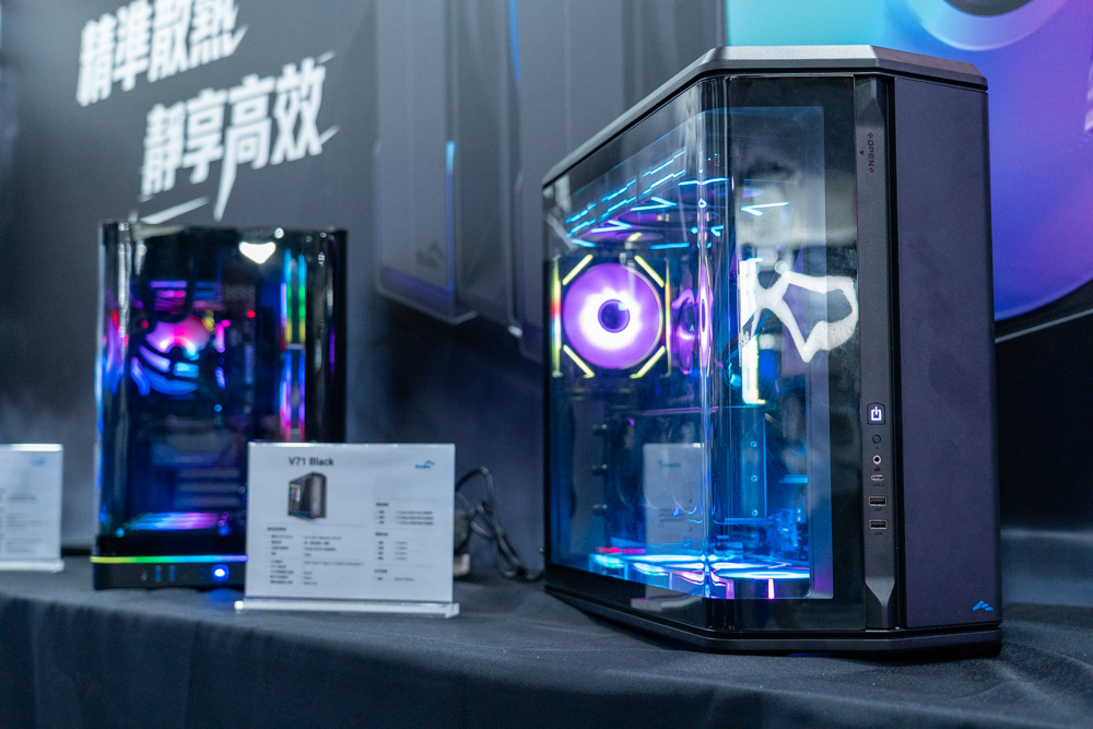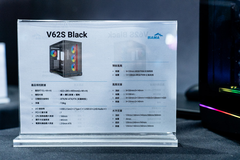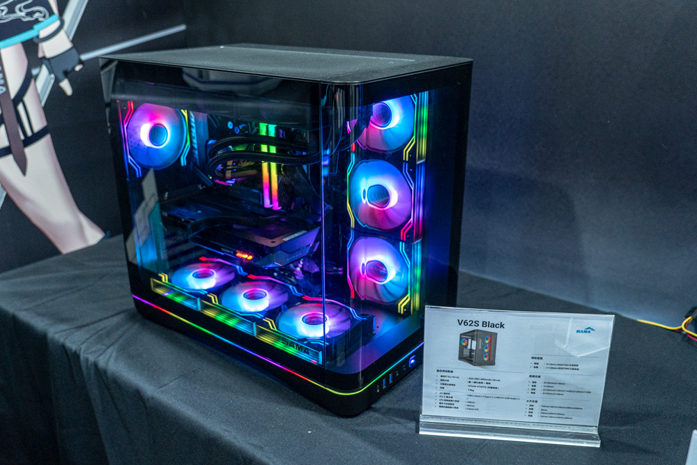 剛進入參觀時,第一眼就能看到全球首發的 V71 與 V62S Black 電競機殼擔當攤位台柱,兩者在外觀上延續了海景房優點,採用左右分艙的結構設計,且各自有著對應規格。