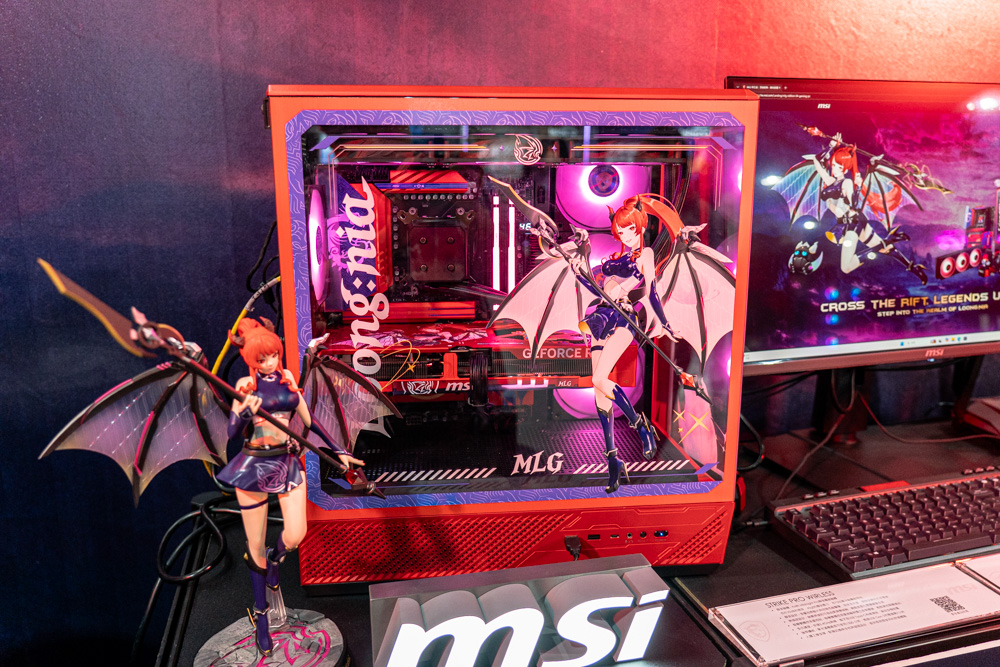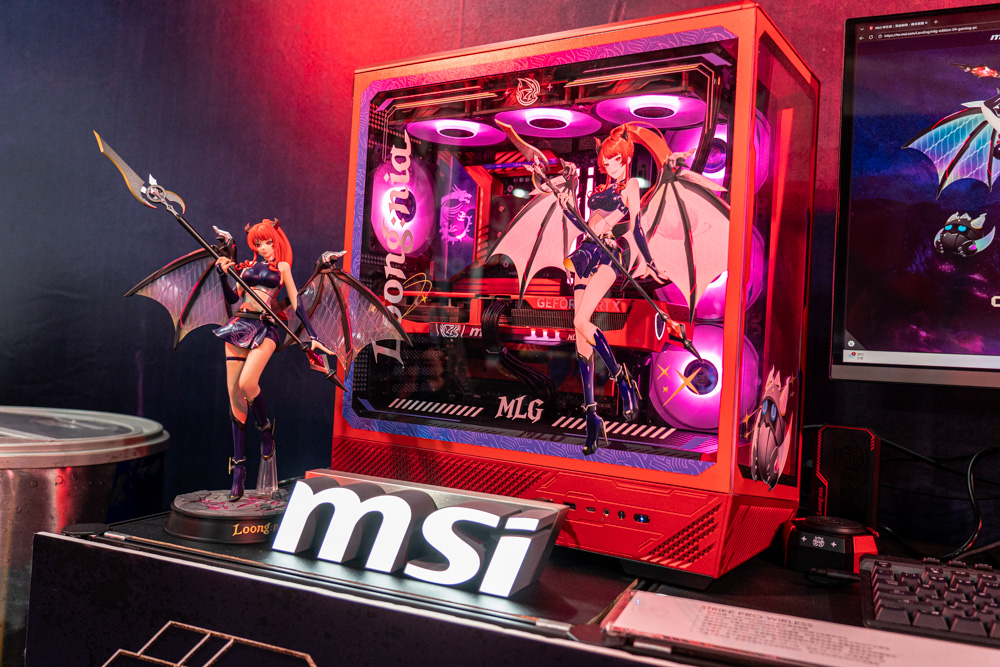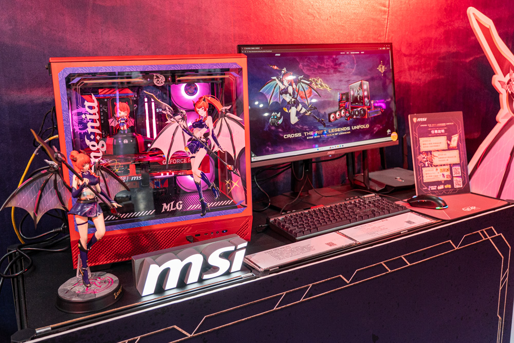 在闖關的同時,也別忘一睹現場的各式電腦主機與硬體週邊,微星此次帶來了兩款重磅電競主機,其一 自然是現場領域 (攤位) 的女主角,魔龍姬MLG特仕版主機,這色氣華麗的紅黑色外觀,不愧是被稱為電競媚魔的魔龍姬 MLG。