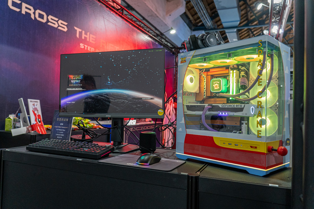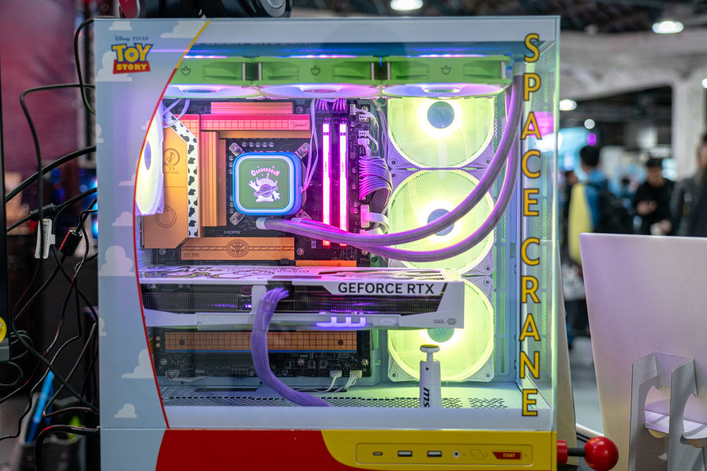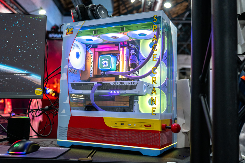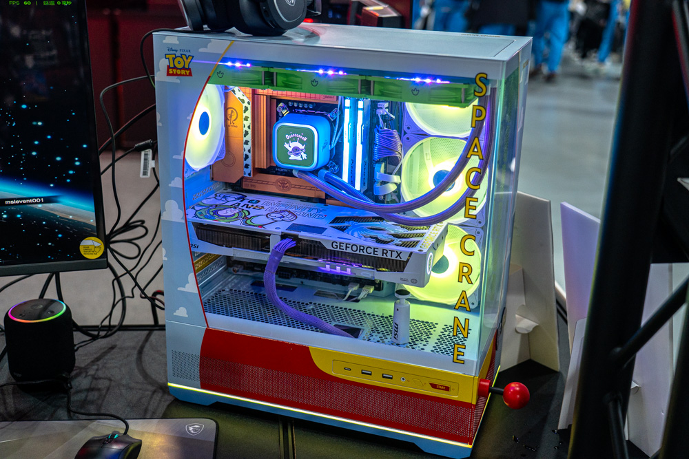 其二 是家遇戶曉的CG動畫 玩具總動員 聯名主機,全身外觀都有著動畫中經典人物的配色風格,例如主機板、水冷、顯示卡等零組件,一眼即認出取自玩具總動員的 胡迪、三眼怪、巴斯光年等經典角色元素,其中整機外觀給人的吸睛度,尤其機殼配色搖桿裝飾,不亞於魔龍姬MLG。