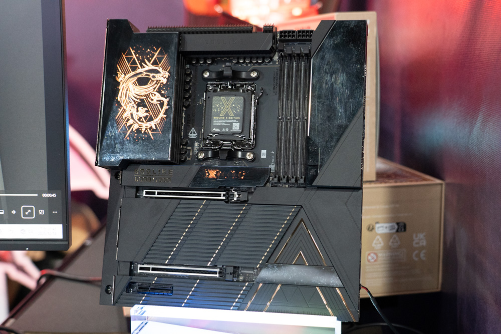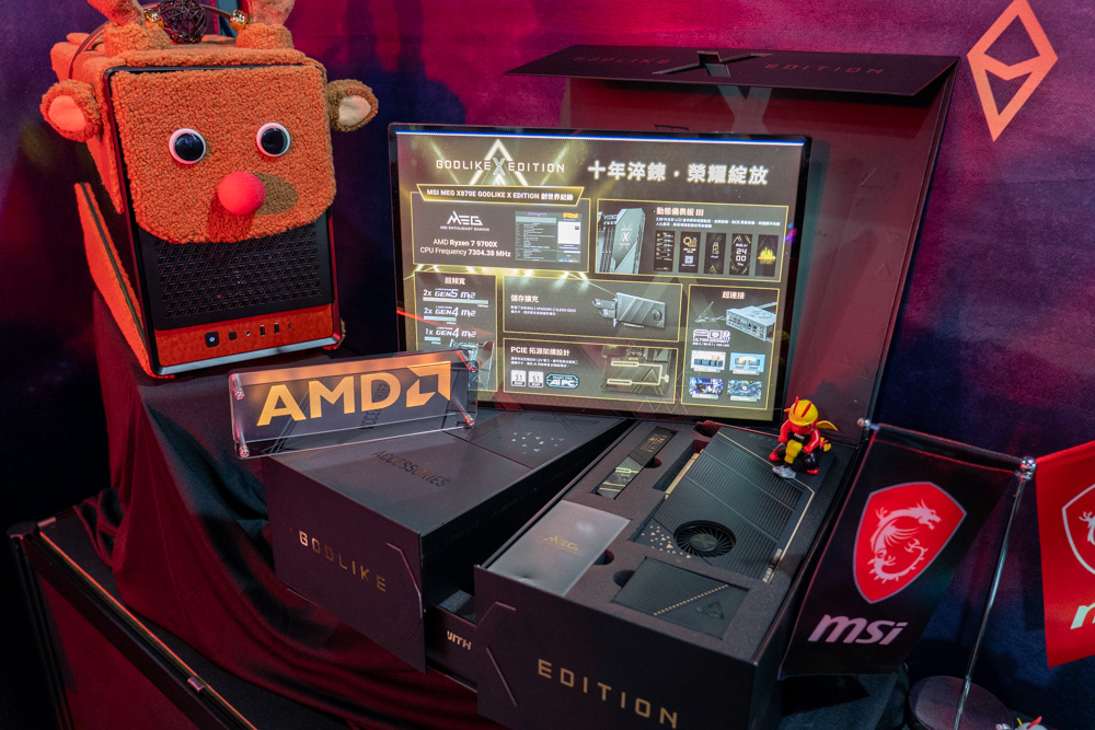 除了體驗遊戲的頂規電競主機外,現場還有一張年度主角,那就是本家旗艦的MEG X870E GODLIKE X EDITION 主機板,全台灣限量 10 張,全在 GAMEFORCE 2025 原價屋獨家販售!可見其含金量,並有著數項真旗艦獨有的豪華特色,如下所列。