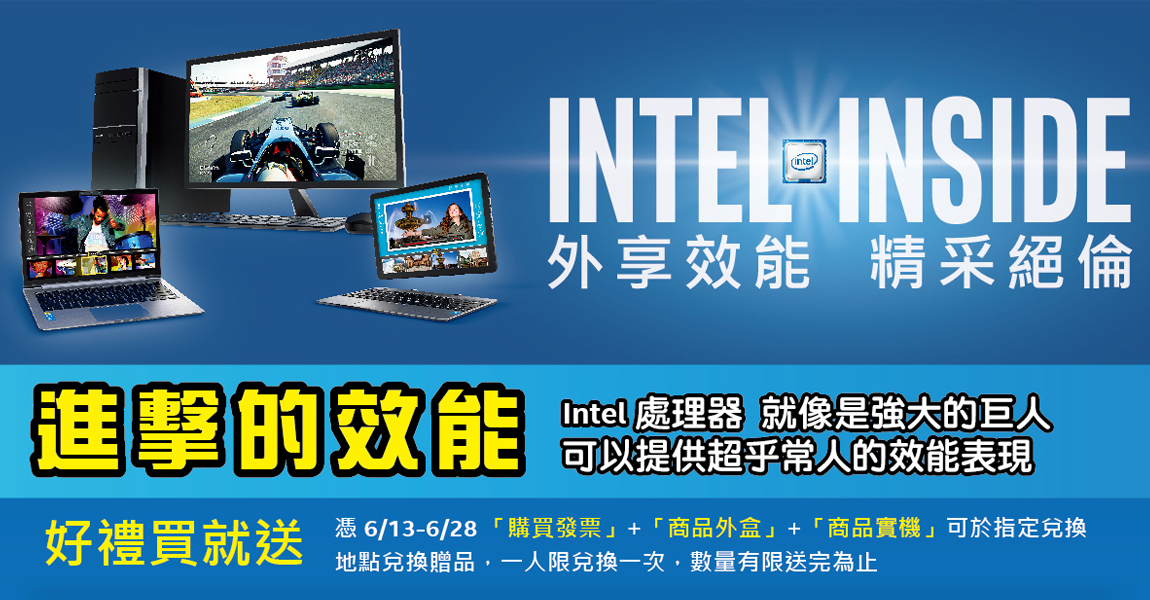 通路活動說明 2015/6/13 – 2015/6/28 購買 Intel 合法代理商處理器 或 搭載 Intel Core 處理器 H/HQ/MQ 系列筆電機種,只要提供【購買發票】和【商品外盒】和【商品實機】,可於指定兌換地點兌換贈品,一人限兌換一次,數量有限送完為止。 兌換資訊說明 北區換資訊 中南區兌換資訊