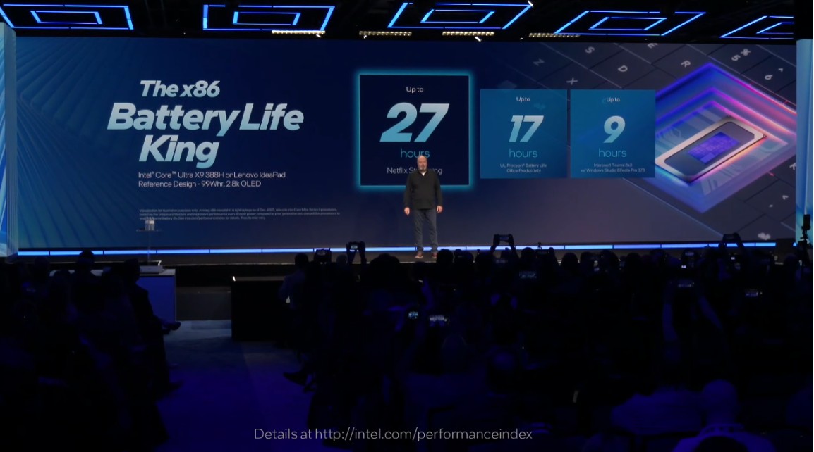 Intel Core Ultra 3 處理器在同瓦效能比較上,可比上一代多出 60% 的多核心效能。而且能提供超過一天 24 小時的電池續航能力。