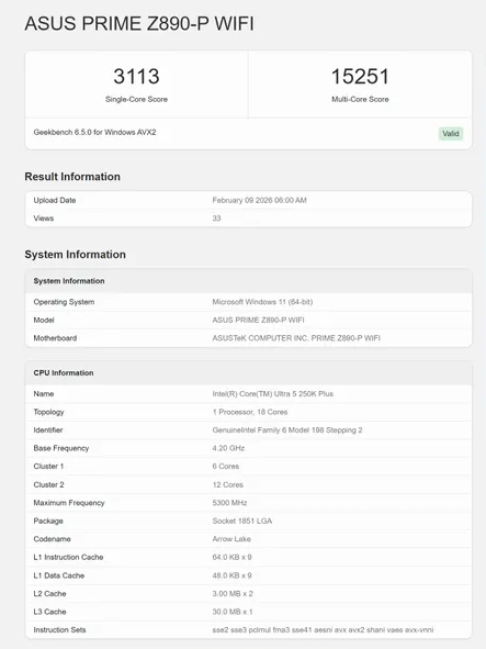 根據洩露的測試數據,Core Ultra 5 250K Plus於單核心測試中獲得3113分,多核心分數則為15251分。