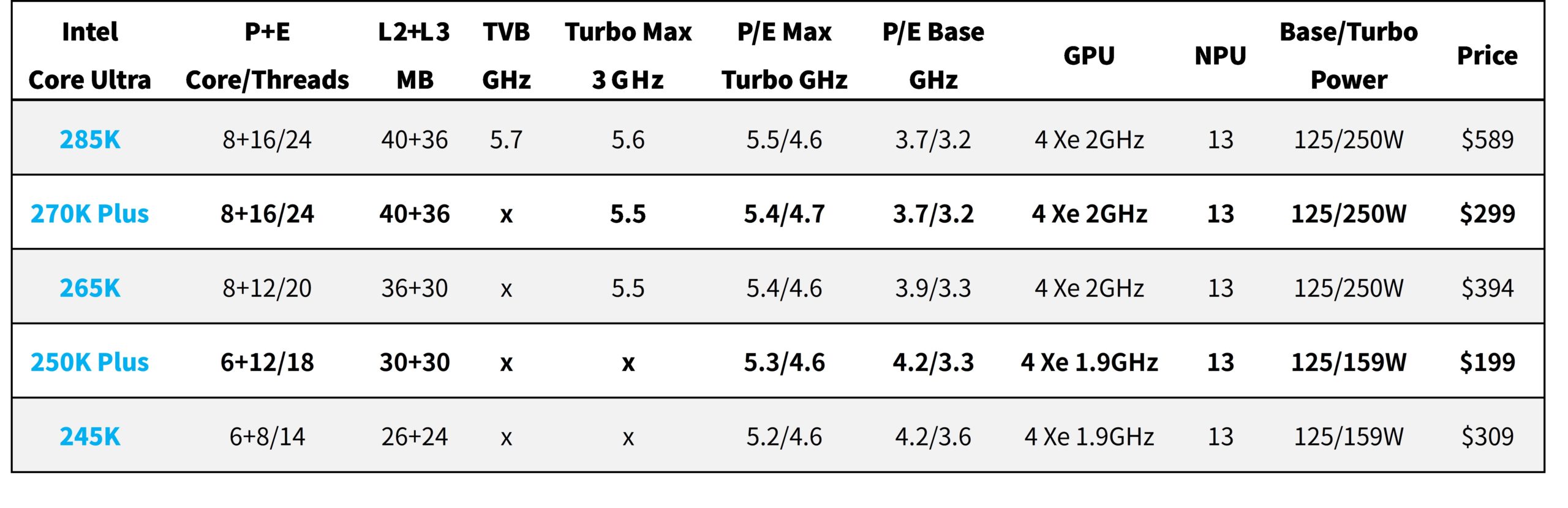 至於 250K Plus 則是增加 E-core 數量的升級版,沒意外就是剛好落在 265K 與 245K 之間。Plus 更新除了核心數、時脈調整外,最重要的是官方建議售價,270K Plus 僅 $299 美元、250K Plus $199 美元,這真的是殺到見骨的打折直接砍半 51%、64% 的價格。