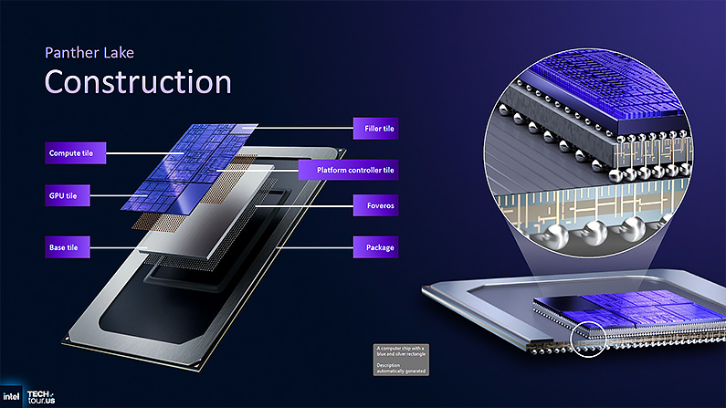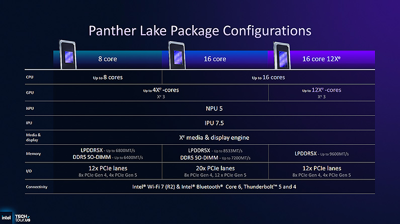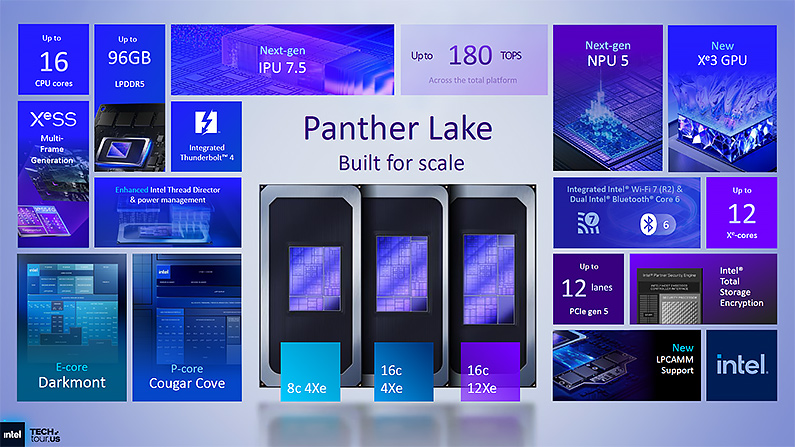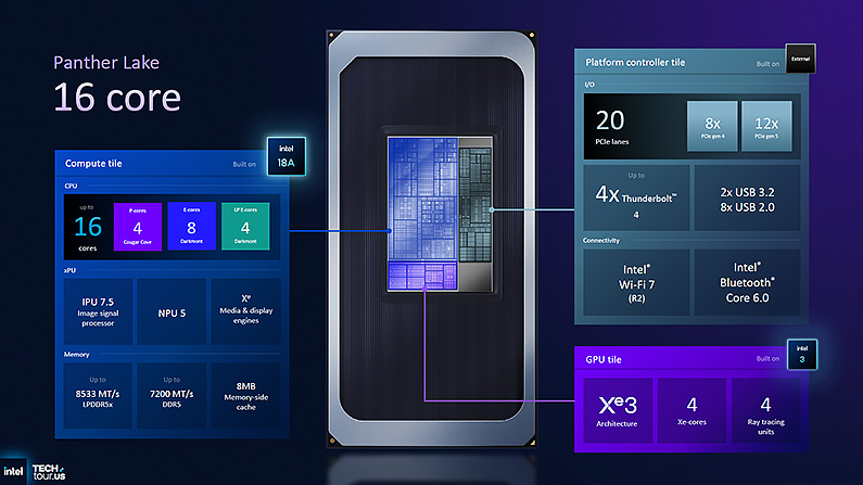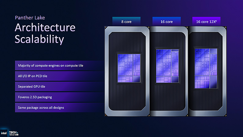 Panther Lake 是整合之前 Lunar Lake 的省電與 Arrow Lake 高效能優勢,整個處理器大致可分為 Compute Tile、GPU Tile 與 Platform Controller Tile 三大區域,Intel 採用不同組合,推出三種組態,讓產品可依特性選擇。