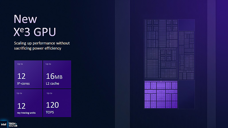 而 16核心加上 12 Xe 核心的版本即是採用較大的 GPU-Tile ,這部分由外部代工的晶片,具有 12 個 Xe3 架構核心與12個 Ray tracing 單元,可提供更高性能與更省電的特色。