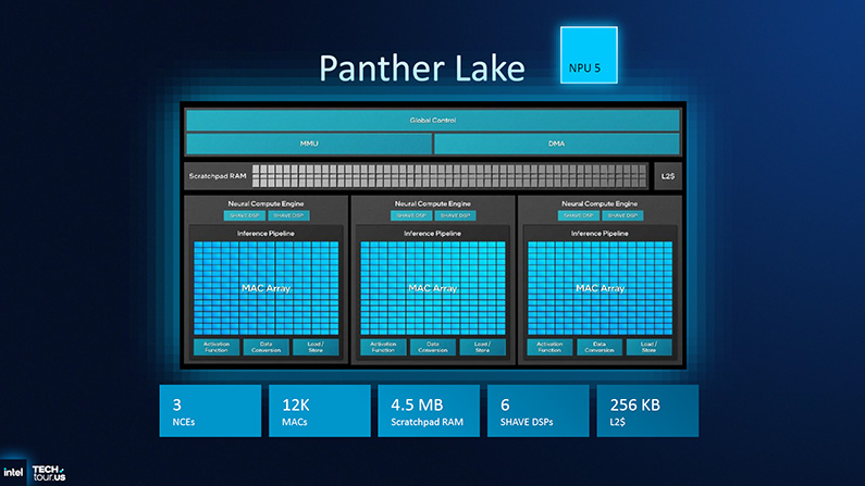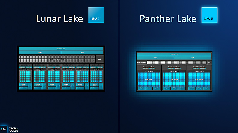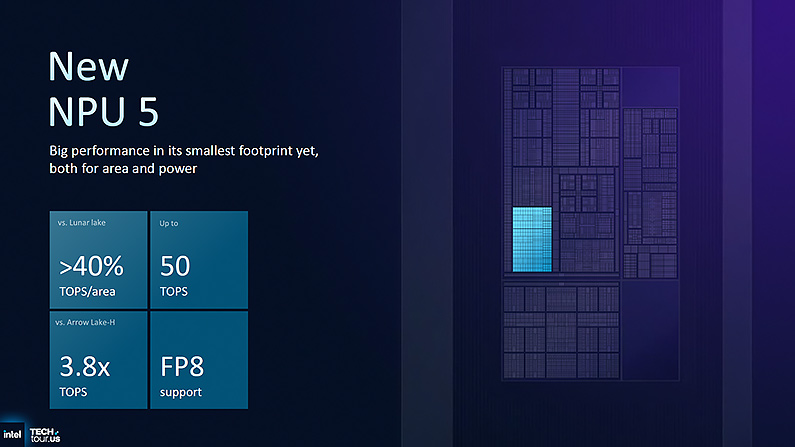 做為新一代 AI PC 處理器,內建的 NPU 5 將 Lunar Lake 的 NPU 4 六組神經計算引擎單元變成三組,每一組擁有較大的乘法累加器陣列(MAC),同時支援 FP8 資料型態,這樣的改變讓 NPU 5 的性能略為提升至 50 TOPs,但是擁有更省電的表現。