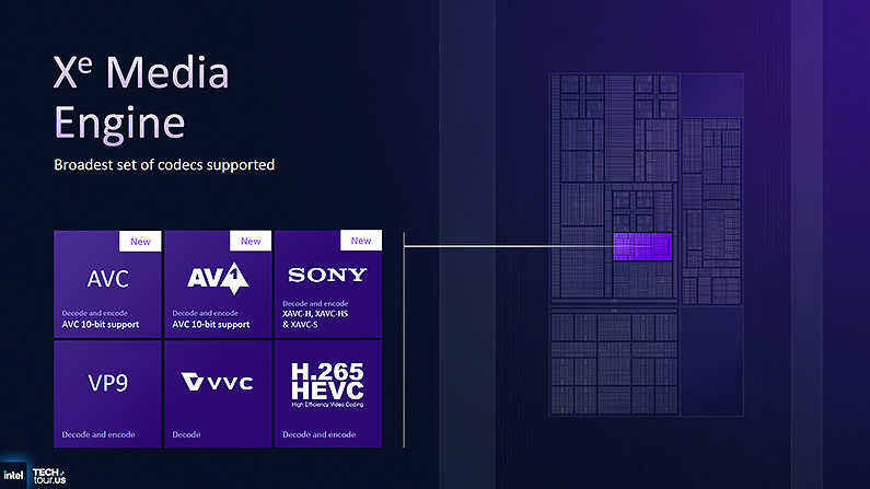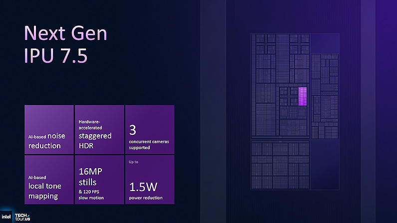 Compute Tile 還包括 IPU 7.5(Image signal Processor)、NPU 5 與 Xe 媒體及顯示引擎,新一代的 IPU 7.5 具有AI 降噪處理以及硬體加速的 staggered HDR,而且更省電,拍攝影片/照片都有更好的表現。Xe 媒體及顯示引擎支援更多新的編解器(codec),包括 10位元 AVC、AV1以及 Sony 的XAVC-H 等。