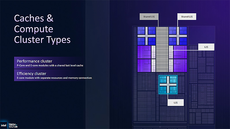 運算的 P-Core(Cougar Cove) 與 E-Core/LP E-Core (Darkmont) 核心叢集與快取記憶體採用與 Lunar Lake 及 Arrow Lake 相似的設計,其中每個 P-Core 皆具有各自搭配的 L2 快取記憶體,而 4個 LP E-Core以及二組 4個 E-Core 則是以四個核心共用一組 4MB L2 快取,L3 快取則是 P-Core 與 E-Core 共用。