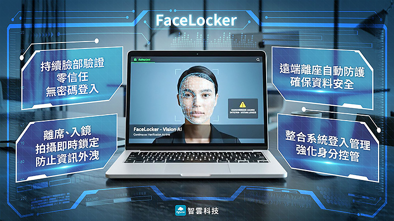 FaceLocker 採用 Vision AI 技術,持續對臉部進行身份驗證,提供無密碼、無感驗證體驗。系統能即時偵測授權人員離席、未授權或多人共用等異常行為,並自動中斷使用與鎖定,確保資料安全。FaceLocker同時具備強大反欺騙(Anti-Spoofing)、反偽造與防偷拍防護機制,即使是異地遠端工作、網路中斷時,亦能透過離線認證持續運作,協助企業打造零信任的安全環境。