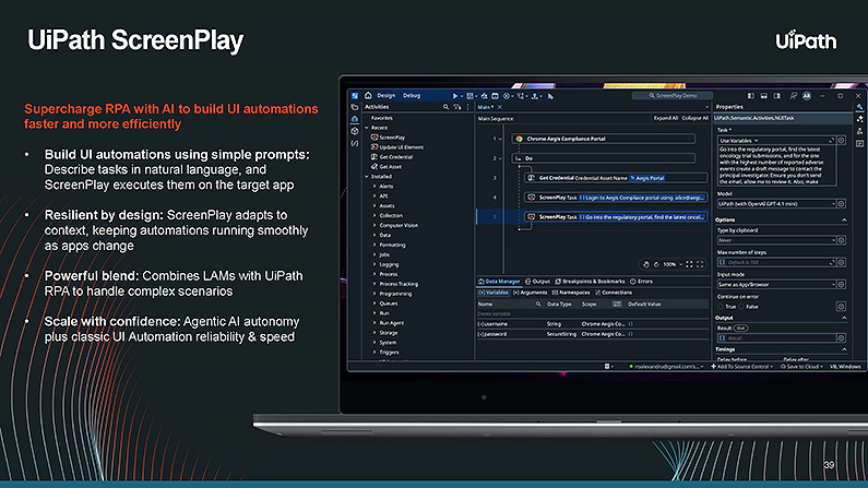 新推出的 UiPath Screenplay 與 API 工作流程,可透過自然語言與端對端 API 流程,提升自動化的可用性並加快建置速度。這些工具結合 UiPath 強大的 RPA 與 API 技術、型語言模型與大型行動模型,有效降低開發門檻,簡化員工與組織的開發流程,進一步降低代理人與自動化建置所需的時間與成本。