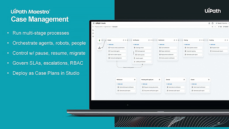 此次 UiPATH Platform 擴充多種新功能,UiPath Maestro 具有端對端的流程編排,其中 Case Management 提供針對理賠、貸款、爭議與調查等預建案例處理流程編排,協助建模、管理與最佳化高優先商務案件的生命周期。新的 Maestro Process Apps 亦提供企業用戶針對所有流程和案例的即時可視化與可操作洞察,協助主動改善作業表現。
