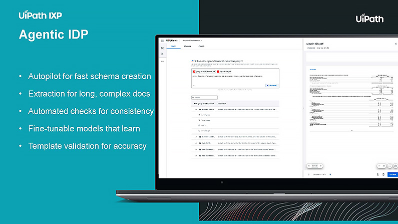 新升級的 UiPath IXP 代理式文件處理功能,可在企業內部安全強化資料與文件驅動的工作流程自動化,其進階資料擷取、驗證與代理式迴圈等能力,可擴展處理複雜的表格、頁面與欄位。另外像是 Autopilot 建立結構、自動擷取代理(Extraction Agents)與驗證代理(Validation Agents)等功能,可降低人工作業量並提供優異的準確度,搭配專屬且可自訂的大型語言模型(LLM),提升處理效能。這些創新功能專為高價值應用場景設計,例如合約比對與系統紀錄驗證,並可與 UiPath Agents 與 Agentic Solutions 整合,加速價值實現,最佳化各產業的文件處理流程。