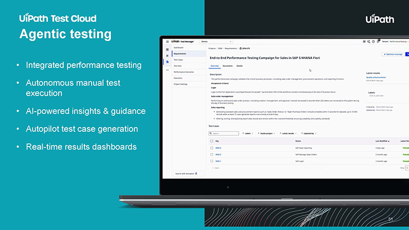 UiPath Test Cloud 提供創新功能,以加速並擴展軟體開發周期中各階段的測試工作。效能測試讓 QA 工程師能模擬真實的使用者流量與工作負載,從識別瓶頸、確保系統穩定性,到驗證速度與回應效能,滿足企業與客戶在大規模環境下的需求。此外,Test Cloud 現在支援 Studio Web 進行軟體測試、自我修復測試自動化、自主測試功能,並可在 Test Manager 中與 AI 驅動的 Autopilot 互動,提供真正端到端的代理式測試解決方案。