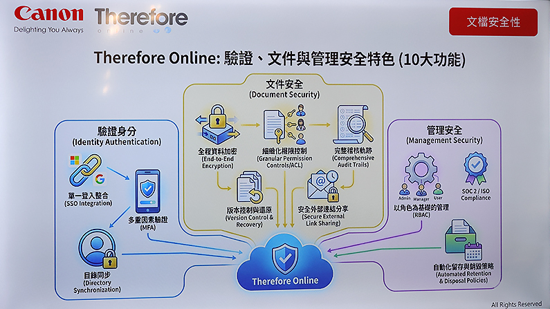 Canon 還特別強調「開箱即合規(Secured by Design/Default)」的設計理念,結合 Trellix、uniFLOW、Therefore 與 ESET 等資安與文件管理解決方案,建構從裝置、列印取件、文件管理到端點防護的零信任資安架構,協助企業加速數位轉型時,可兼顧合規要求與風險控管。
