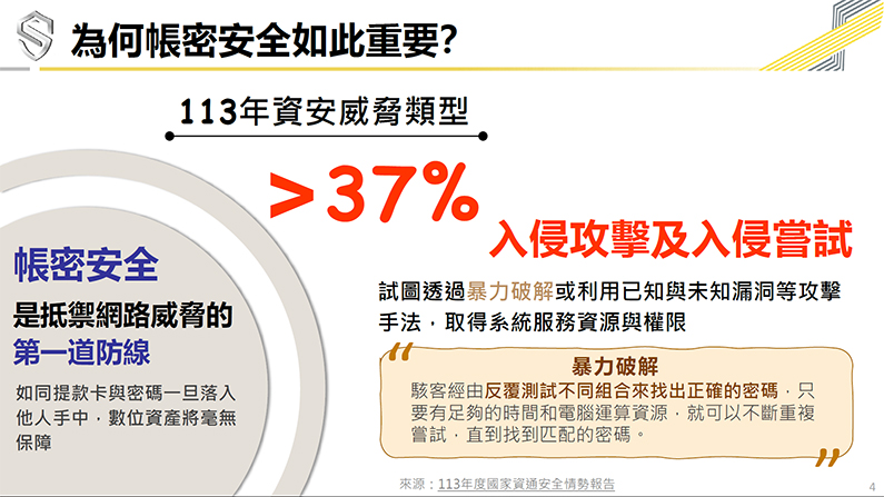 針對近期日益嚴峻的網路入侵威脅,數位發展部資通安全署(下稱資安署)特別說明強化帳號密碼安全等具體做法,呼籲全民要強化帳號與密碼安全以提升資安意識。資安署更提醒常見之弱密碼如「123456」、「admin」或以鍵盤排列順序如「QWERTY」等這類密碼,利用自動化工具幾乎可瞬間破解,請大家切勿使用這類密碼。
