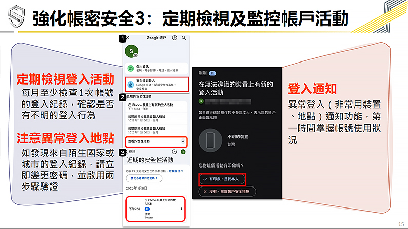三、定期檢視登入活動:建議定期檢視帳號登入紀錄,透過檢視登入的時間、地點或設備,檢查是否有異常存取,如發現不明登入足跡,應立即登出所有裝置並更換密碼。
