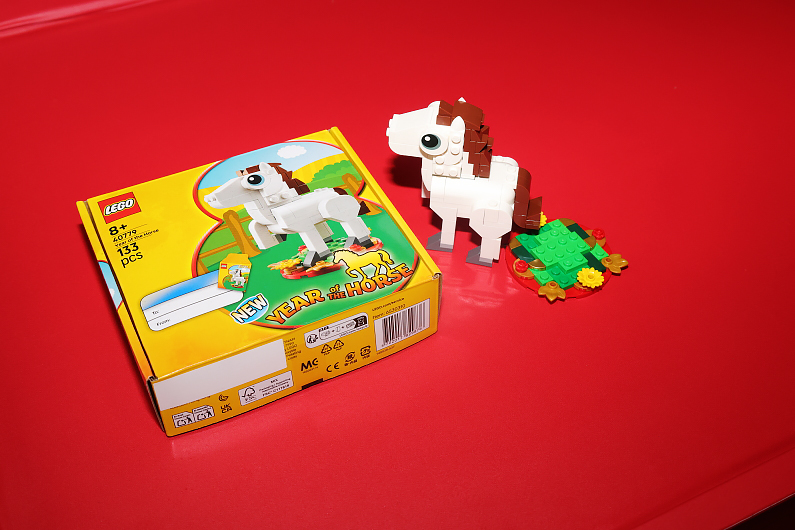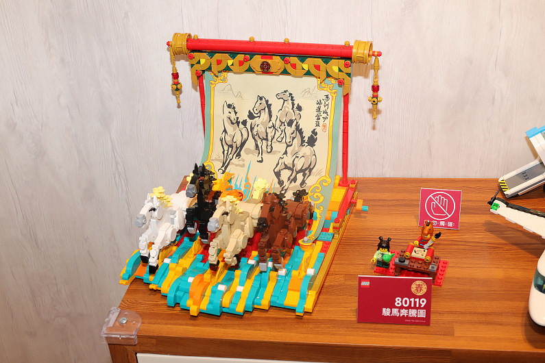 80119 駿馬奔騰圖則有四匹奔騰駿馬的印刷水墨畫畫布可當作模型背景,象徵新年「馬到成功」,而四匹積木玩具馬還可轉動把手讓馬動起來,彷彿從畫作中奔騰而出,更有力量的象徵,盒中還有畫家與身穿馬年服裝的人偶可搭配擺設。