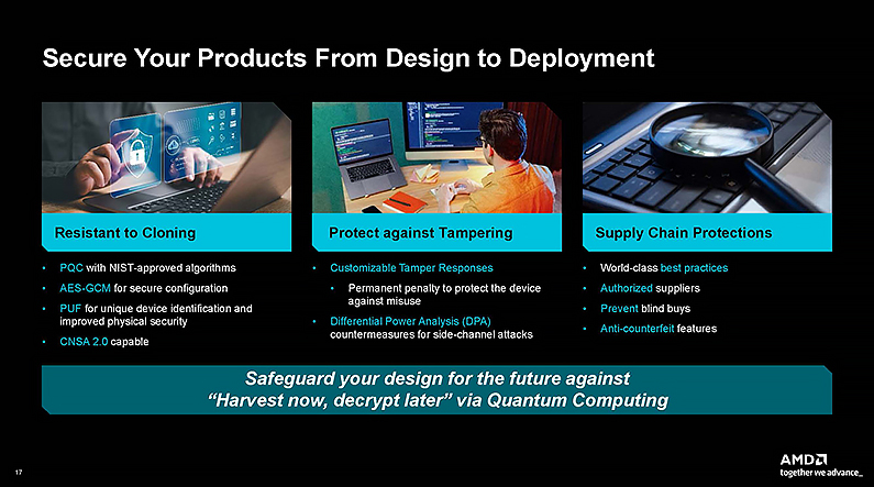 Kintex UltraScale+ Gen 2 面對今日以及未來的量子運算時代需求,特別將許多先進的安全功能直接整合其中,包括設備執行認證、位元流加密、防複製保護、安全金鑰管理和 CNSA 2.0 等級加密與演算法等,以避免產品被複製、竄改,更支援供應鍊安全,諸多的設計讓產品從設計生產到部署都能受到保護,有助於保障智慧財產權。