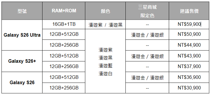 今日台灣三星電子公布大家最在意的產品規格與建議售價,同時還公布三星商城二種限定色,預計 3月18日於各指定通路正式上市,即日起至 3月11日止接受預購。以下表格為 Galaxy S26 系列上市規格與售價:
