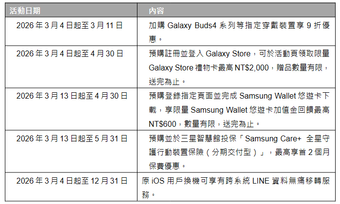 Samsung 宣布推出 Galaxy S26 系列旗艦新機與 Galaxy Buds4 系列耳機後,台灣三星電子也公布在臺灣市場銷售的規格與售價,並公開三星商城限定色,即日起開始接受預購。