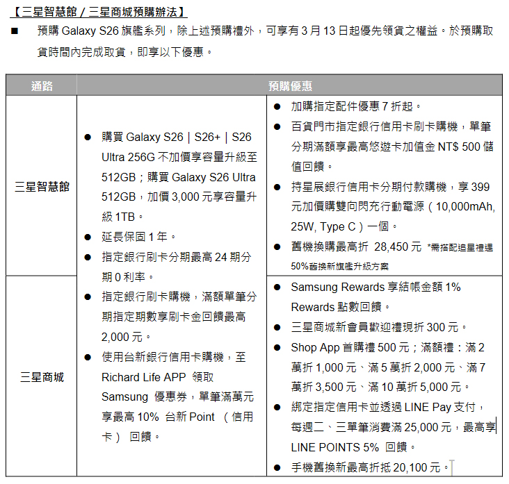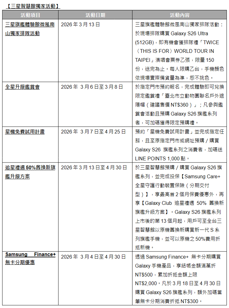 Samsung Galaxy S26 系列預計 3月18日起於各指定線上與線下通路包括電信商正式上市,台灣三星電子也宣布即日起開始至3月11日止接受預購。參加預購活動可獲得多項優惠,也有和過往一樣的儲存容量免費與優惠升級方案,即預購且於指定時間內完成取機,購買三款機種 256GB 版本皆可免費升級至 512GB,而預購 S26 Ultra 512GB版本的消費者,也僅需加價 3000 即可升級至 1TB 版本。