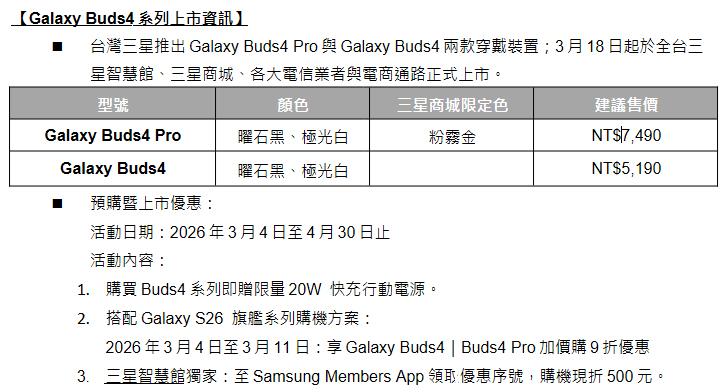 與 Galaxy S26 系列同時推出的 Galaxy Buds4 系列無線耳機售價、規格以及預購/上市優惠資訊如下: