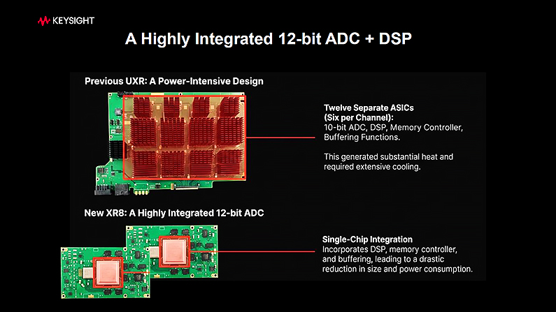 Infiniium XR8 硬體採用新的設計,特別是前端與數位核心做了大幅度的更新。首先是前端(Front-End)把過往多顆晶片及分散式元件做整合,以單一顆 ASIC 取代,大幅減少所需的空間,且採用連接方式減少路徑損失,大大提升訊號的完整度。而擁有 ADC(類比數位轉換器)與 DSP(數位訊號處理器)的數位核心同樣也採用高整合技術,將過往每個量測通道上的 10位元 ADC、DSP、記憶體控制器與緩衝功能分開的 ASIC,全部整合成單顆 ASIC,同時也將 ADC 精度提升至 12位元。