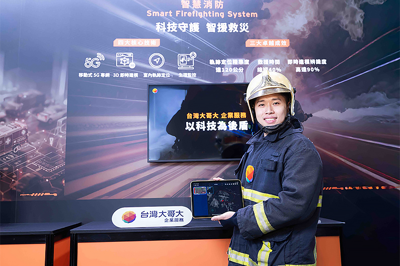 在「智慧消防」領域中則展示具有四大核心技術的「5G 智慧消防輔助救援系統」,包括:一、抵達現場數分鐘內即可完成移動式 5G 專網架設,二、利用 LiDAR 技術在惡劣環境下可即時產生室內 3D 地圖成為可視化情資,三、室內軌跡誤差120公分以內的高精準定位,讓指揮中心掌握消防員的位置以提升調度精確度;四、透過即時監控隊員的生理資訊與氣瓶殘量,在危險發生前發出警報提醒撤離。相較於過往使用人回報與確認方式,利用科技輔助可大幅縮短火場應變時間。